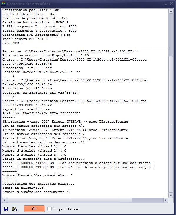 depuis ce matin j'ai un problème étrange qui m’ennuie beaucoup. Quand je demande une recherche automatique des asteroïdes / comètes avec 3 images par exemple mais ça fait pareil avec plus, la fenêtre de traitement commence affiche les coordonnées des images et plante en fermant le logiciel sans rien dire !
