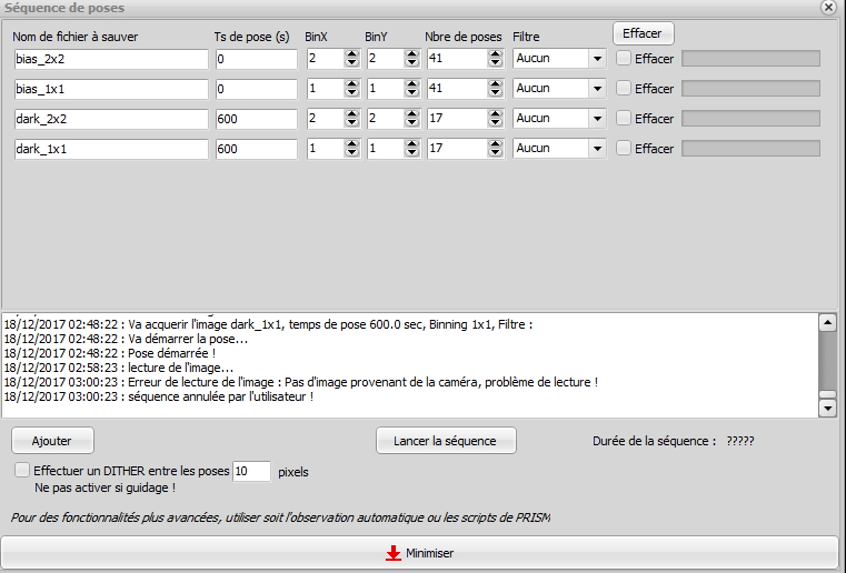 Hier soir je lance une séquence d'acquisition de bias et de darks via le séquenceur de poses. Ce matin je trouve le message d'erreur suivant :