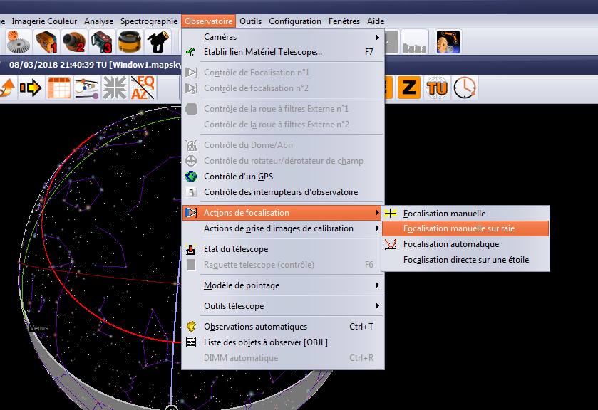 La focalisation sur raie est accessible par les menus Observatoire/Action de focalisation: J'effectue une première capture et réduis (éventuellement) la fenêtre.