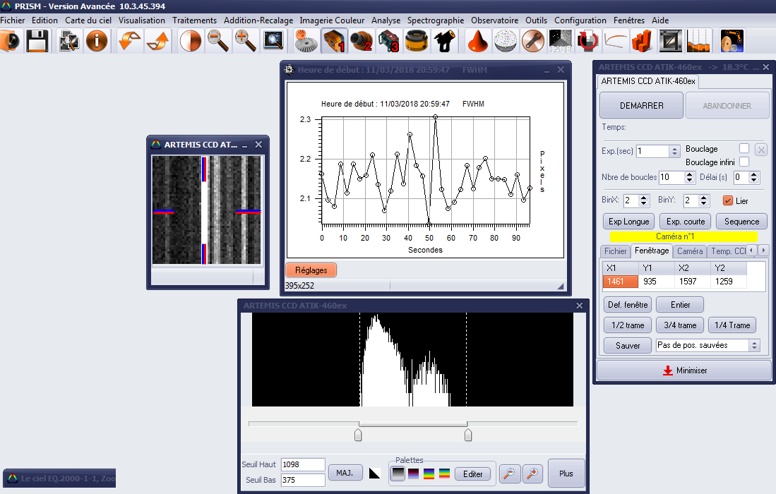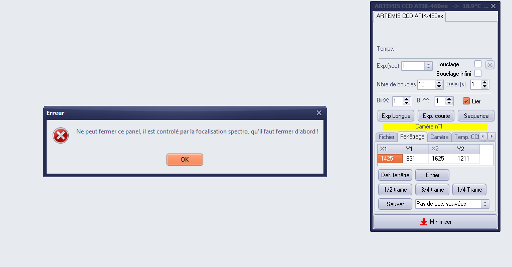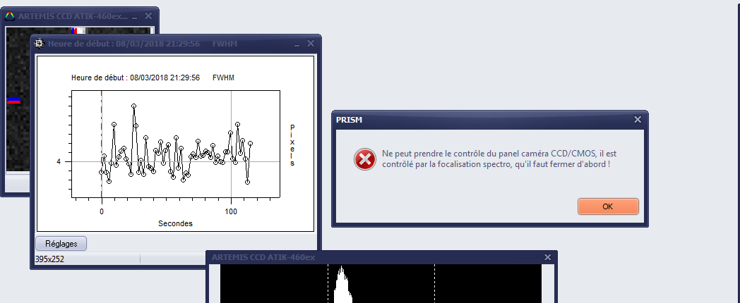 Lorsque je stoppe une action de focalisation sur raie, Prism me demande si je veux voir un historique de la focalisation sous forme de graphique mais n'autorise pas la reprise du contrôle de ma caméra (que ce soit une Atik414EX ou une ASI ZWO) Un message indiquant que l'action de focalisation n'est pas terminée s'affiche alors qu'elle est terminée. J'ai effectué plusieurs essais mais presque à chaque fois j'aboutis à ce blocage du logiciel. Et je suis obligé de redémarrer Prism puisque je n'ai plus accès à la caméra.