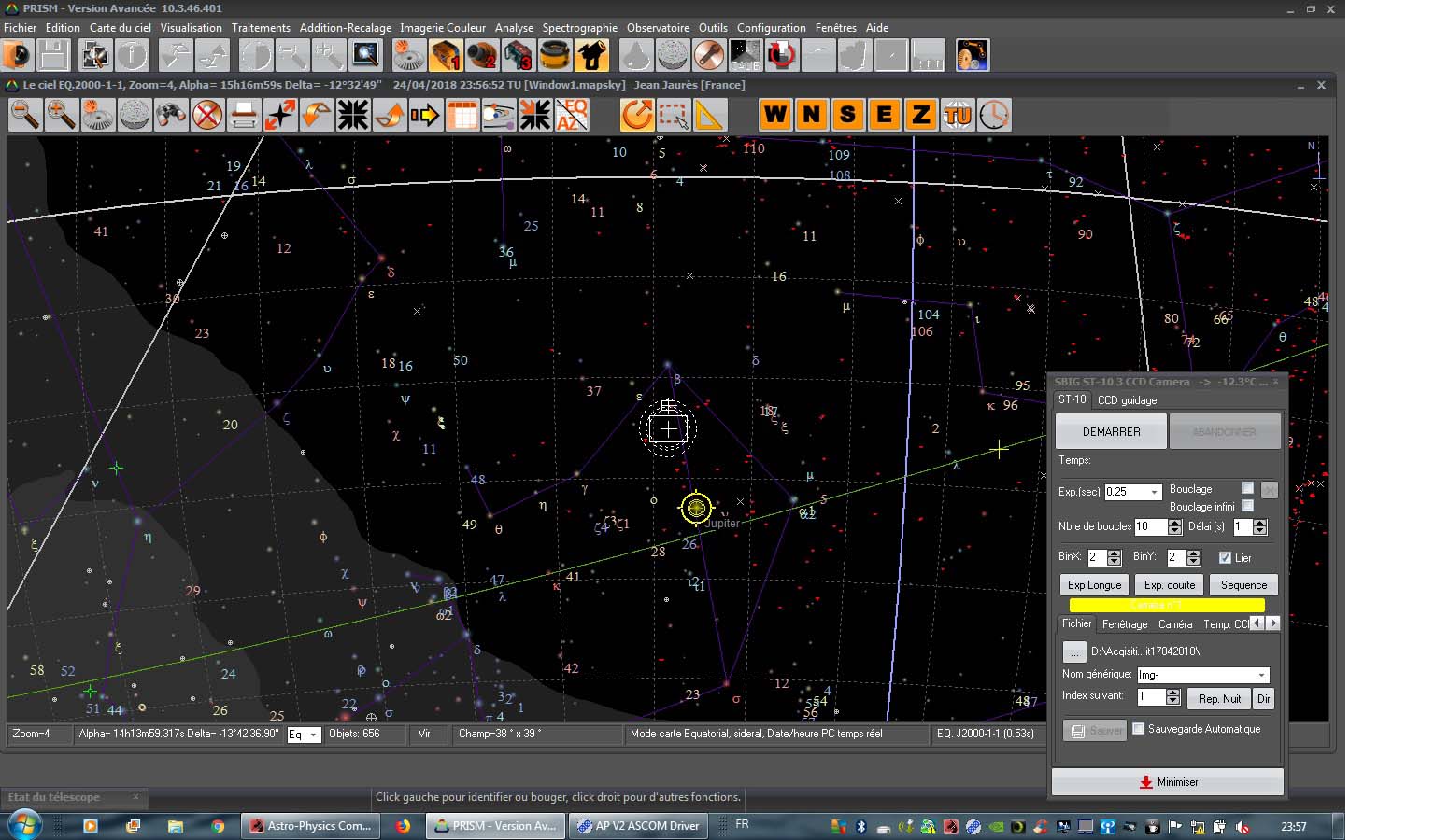 SI je comprends bien, chaque fois que que je maintiens pressé le clic gauche et que je "drag" la carte, le symbole de la CCD (rectangle blanc) suit le déplacement de la carte . J'ai bien observé que le symbole du télescope (rond jaune) , lui, ne bouge pas de la position où il pointe, bien sur.