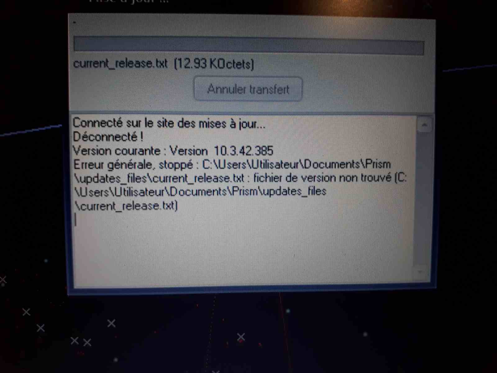 Erreur Fatale: La taille (2212352/0) du fichier "c:\Users\\user\documents\prism\updates_files\update.exe" est invalide, le processus de mise à jour est abandonné.