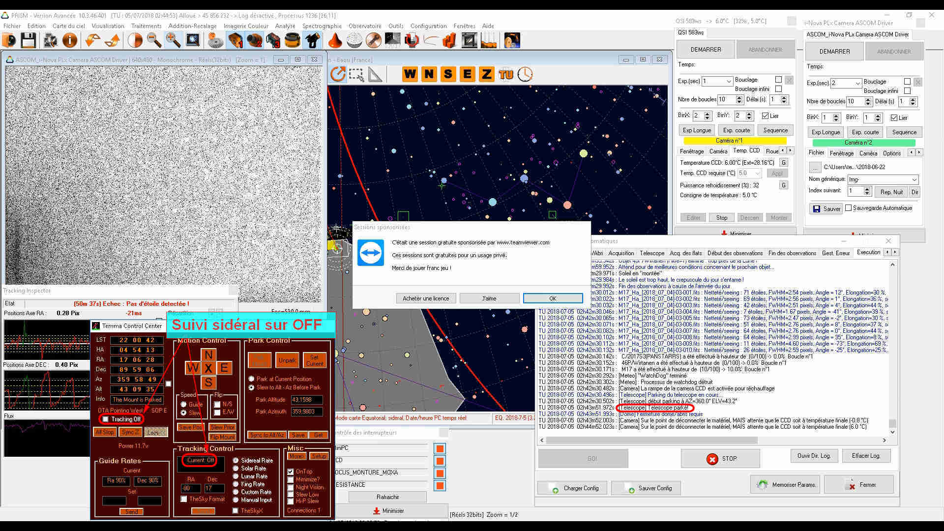 Je viens de faire une vérification d'arrêt du suivi sidéral (c'est précisément ce que je demande à PRISM pour que le tube ne heurte pas la monture). En configurant une prise de FLATS le soir et en lançant l'OBS-AUTO on voit bien que la case du suivi sidéral de l'interface TEMMA est décochée et que le message "Tracking is off" apparaît. De plus je vois bien que la monture ne compense plus la rotation de la Terre. Voir image :