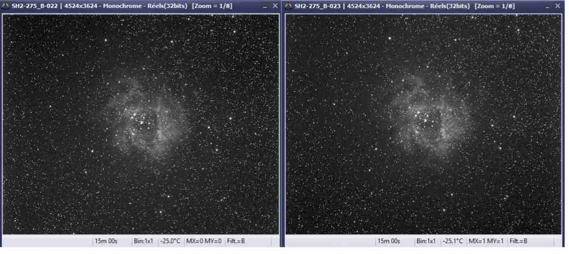 Première difficulté : la gestion des miroirs X et Y. Lorsque je photographie un premier objet en première partie de nuit, le retournement au méridien se déroule bien concernant la gestion des miroirs. Exemple pour la Rosette cette nuit.
