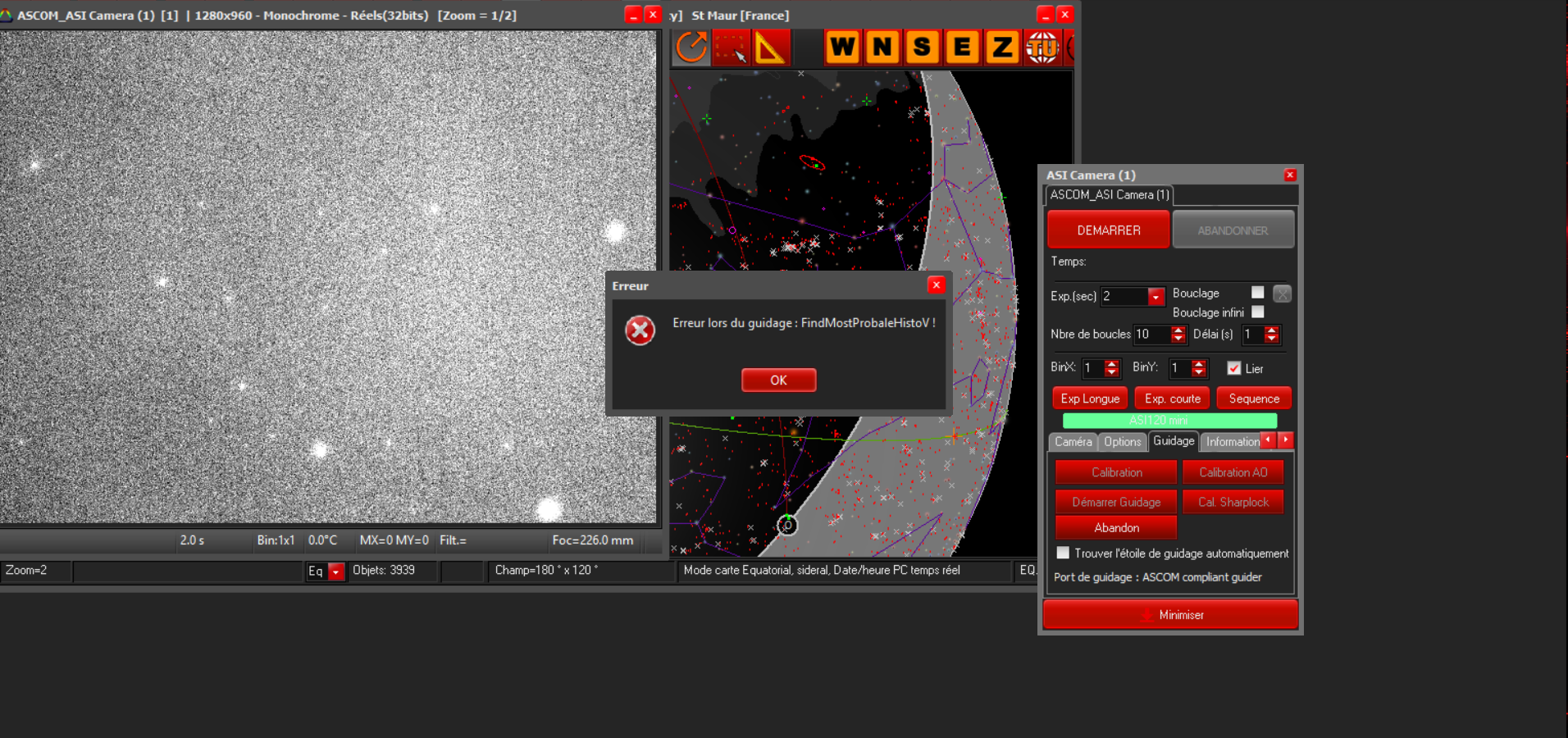 La calibration se passe bien mais une erreur apparaît dès le lancement de l'autoguidage (ici avec la 120mini :