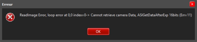 Via ASICap je vois que la caméra est sur 8bit par défaut. Si je passe en 16 bit (conseil ZWO) et que je connecte aussi Prism dessus (mon idée), les prises de vues simples fonctionnent mais toujours le même message d'erreur en guidage (puis blocage Prism).