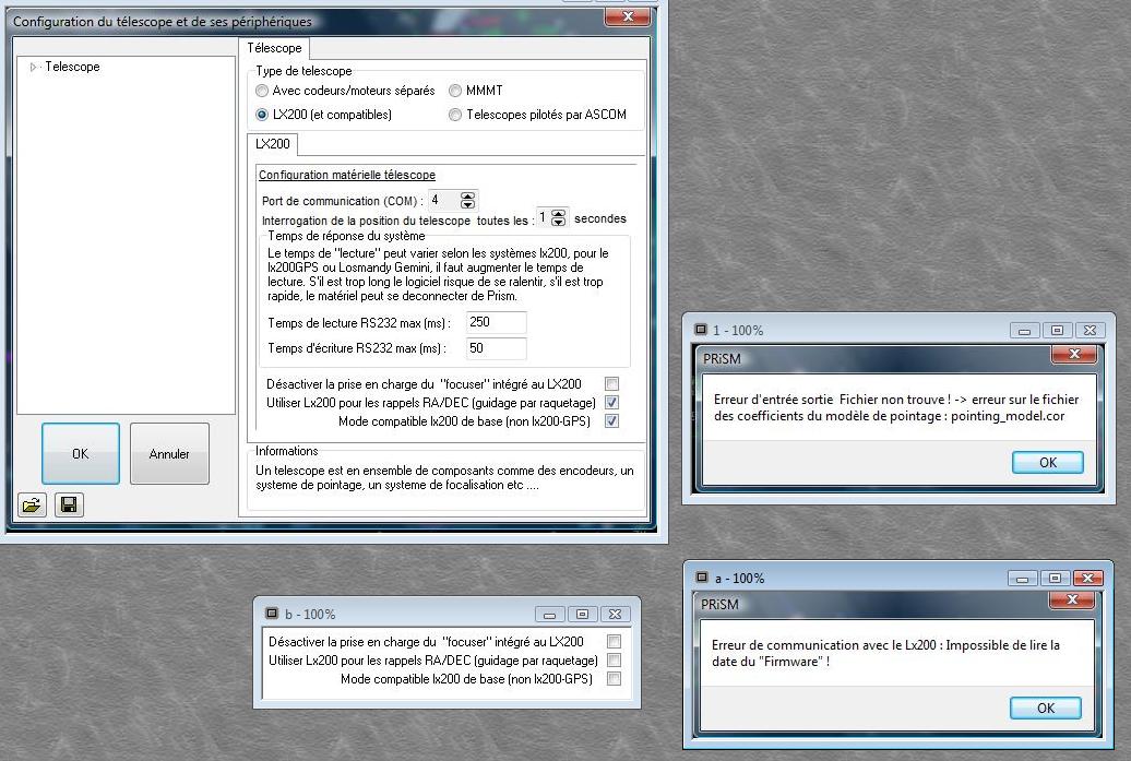Je n'arrive plus à configurer PRISM 7.2.16 pour la liaison PC (sous vista) et mon ancien LX200 ?