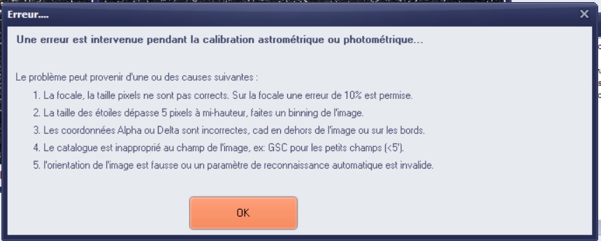 Thomas MOLLIER a écrit : 05 juin 2020, 18:12 Deuxième question : je calibre astrométriquement par le biais d'Astrometry.Net. La calib' automatique ne fonctionne jamais :?: :| Pourtant lors des acquisition, une fois la réduc' faite avec Astrometry.Net, ca fonctionne bien. Je refais le même boulot en traitement quelques jours après, ca ne fonctionne plus... :shock: