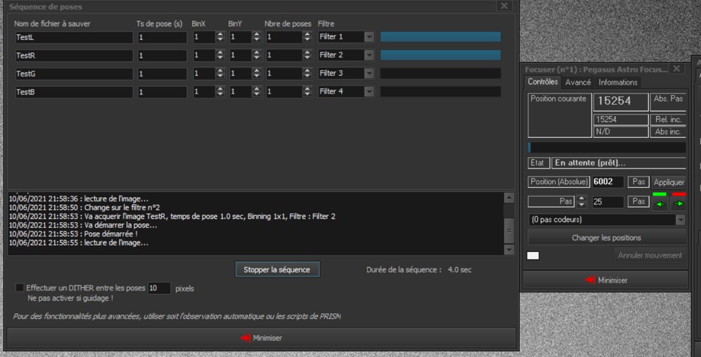 J'ai fait le test avec une séquence d'acquisition d'images avec chaque filtre de la roue, 1 pose pour chaque filtre, LRGB... et retour au premier filtre L). La roue et le focuser sont configurés comme dans les messages ci dessus. Même mouvement de 2 pas codeurs au changement de filtre R puis etc... constaté. AU retour final au filtre L Prism revient à la position initiale+1 pas codeur.