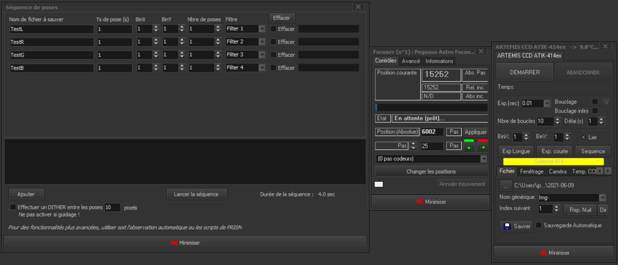J'ai fait le test avec une séquence d'acquisition d'images avec chaque filtre de la roue, 1 pose pour chaque filtre, LRGB... et retour au premier filtre L). La roue et le focuser sont configurés comme dans les messages ci dessus. Même mouvement de 2 pas codeurs au changement de filtre R puis etc... constaté. AU retour final au filtre L Prism revient à la position initiale+1 pas codeur.
