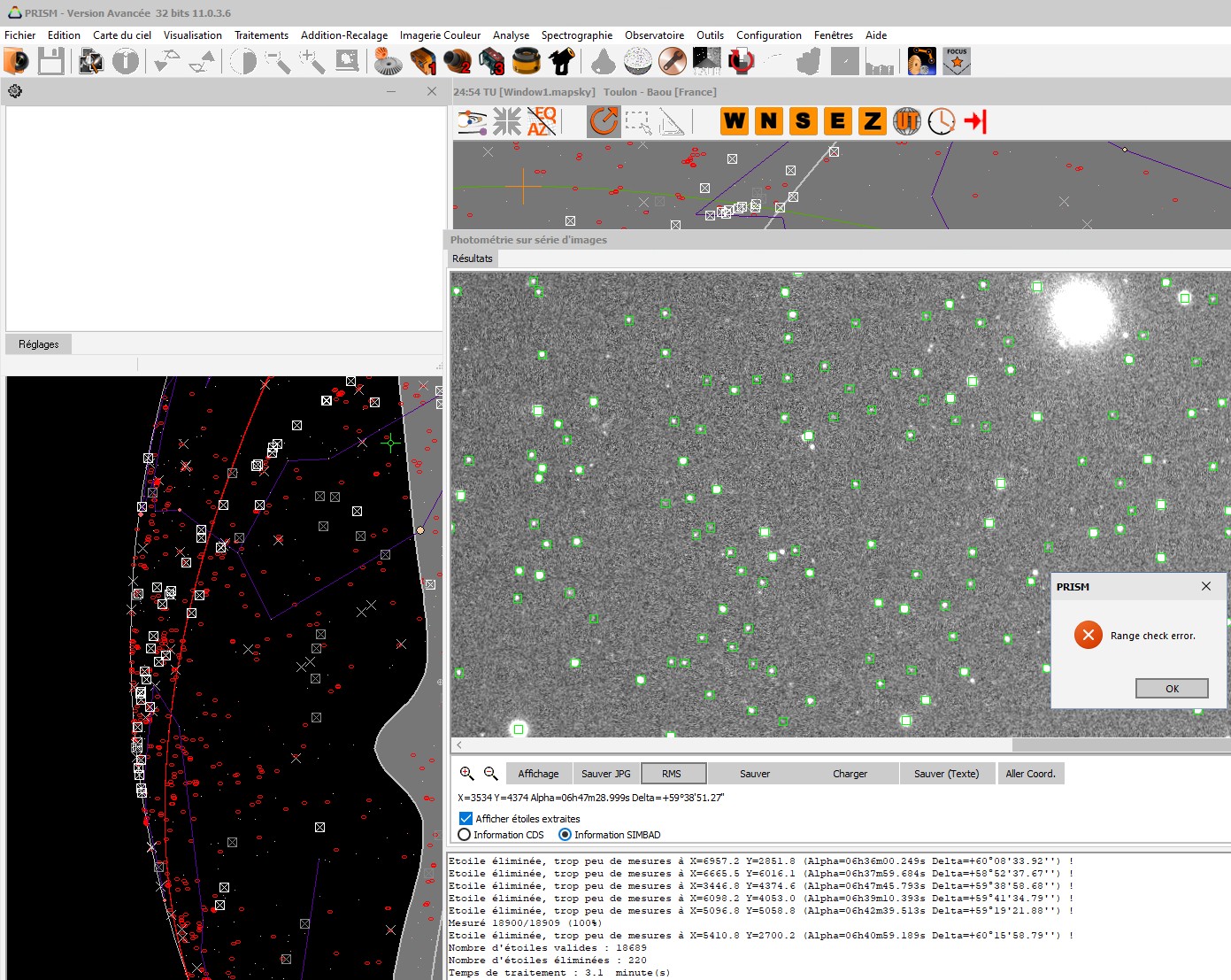 Objet Résolution X Résolution Y Nb pixels Etoiles valides Catalogue Range check error lors de lancement de RMS