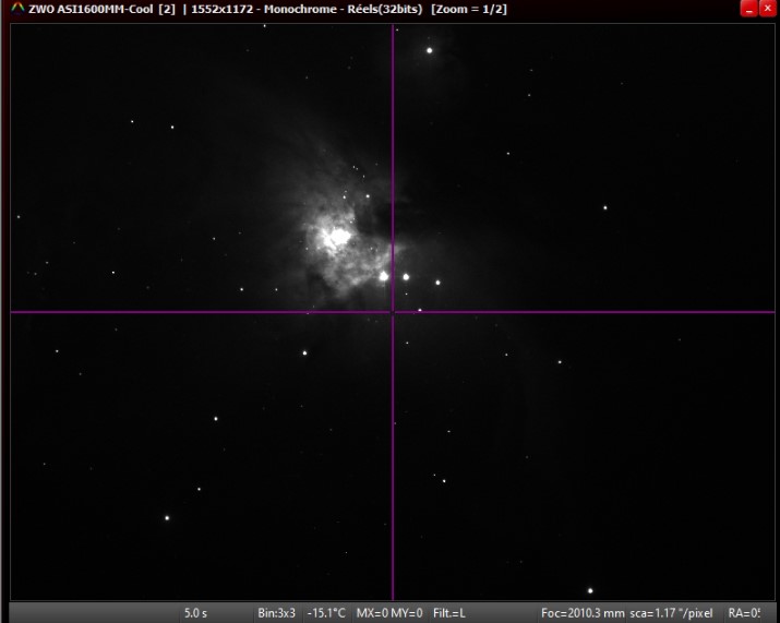 Je pointe M42 en cliquant sur la carte du ciel. Je fais un recalage astrométrique : le coeur de M42 n'est pas au centre de l'image :