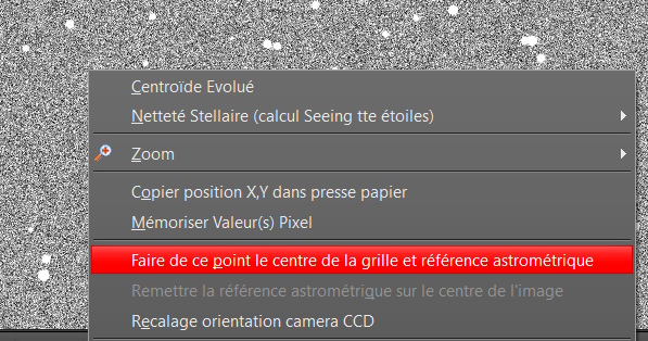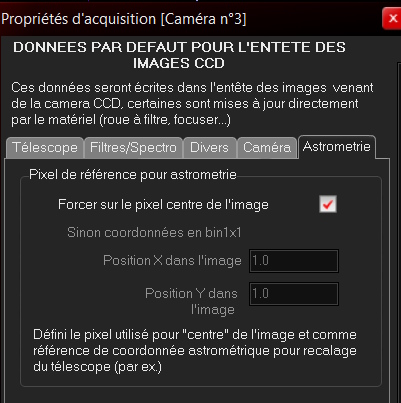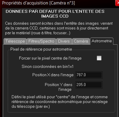 Pour revenir au centre du capteur comme référence astrométrique, Il faut utiliser le menu contextuel correspond juste au dessous du précédent. Au pire, depuis l'onglet "Divers" de la caméra, ouvrir l'entête et cocher sur "forcer sur le pixel au centre de l'image".