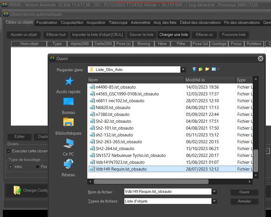 (ctrl+Q ou menu etc) Je ne peux plus charger les listes d'observation automatique générées par Prism V10.