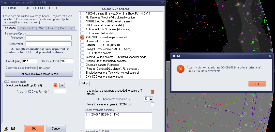 Je viens d'appliquer le correctif de Cyril Cavadore et cela résout le problème avec la caméra ZWO mais envoye un message d'erreur lorsque on veut quitter le menu via le bouton OK ?? Voir fichier joint prism-problem.png