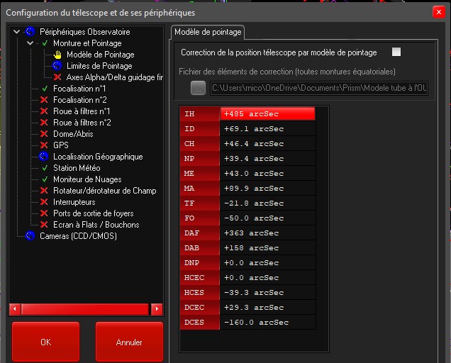 Etant en poste fixe, j'ai souhaité introduire un modèle de pointage dans Prism V11.4.19.39. La monture est une Astrophysics AP1600GTO connectée par ASCOM.