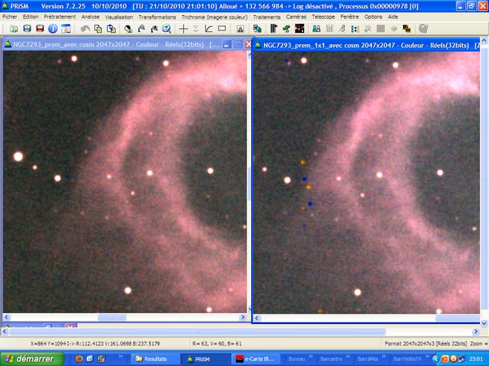Par contre, en utilisant les offsets et noirs faits en binning 1x1, même avec un fichier cosmétique, les points restent (le point bleu et dû à un plantage au changement de filtre ayant nécessité un reboot et la stabilisation en température du CCD). La comparaison ci-dessous est faite entre images non traitées (seul un réglage des seuils a été appliqué) mais avec binning différent illustrant la supériorité du prétraitement avec les offsets et noirs en binning identique aux images couleur à traiter.