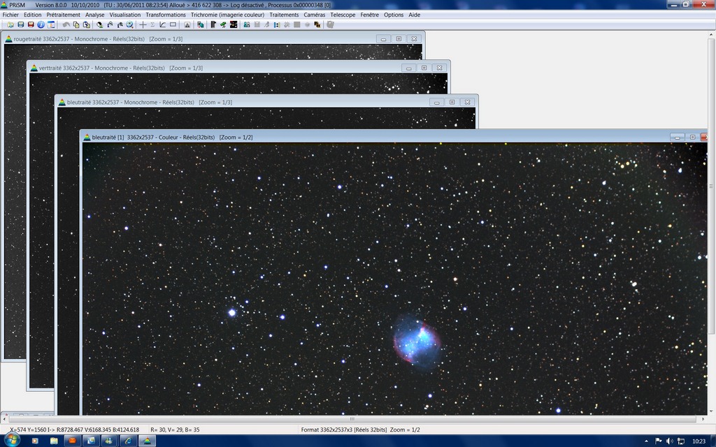 desolé mais je ne comprend pas bien la question ! c'est quoi l'image de reference et la fonction employée !! pour moi l'image finale de reference est l'image de toutes mes brutes traités registré ,recalé aditionné , dans les quatres couches LRVB , ensuite je vais dans trichromie et j'assemble tout, ensuite je fait recalage auto et la ça ne marche pas !! voila cordialement, je vous est dit que RVB marche tres bien mais pas LRVB