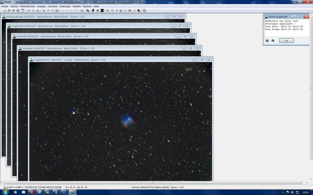 de votre coté pouvez vous me dire ce qu'est une image de reference !! car la je ne comprend pas bien çe que vous demandé ? J'ai quatres images LRGB toutes traitées avec PRISM prétraitement complet , recalage , adition , dans chaque couche, c'est ça les images de references ou pas ? la je ne peu pas mieux m'expliquer, ou alors donner moi la façon de proccéder pour arriver a aligner LRVB . comme je vous l'ai dit RVB fonctionne bien. merci