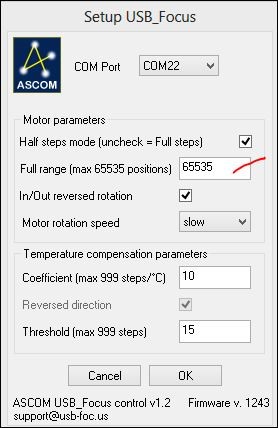 Il faut aller dans le setup de USB focuser et changer la valeur 1 qui se met par defaut (et qui empeche tout deplacement), par la valeur 65535 pour etre tranquille ->