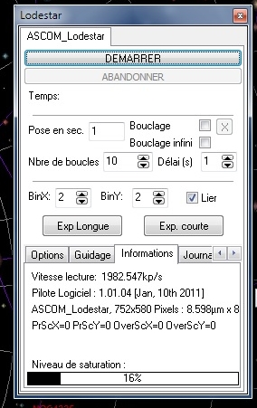 J'ai testé le driver Ascom pour la Lodestar. Le binning 2x2 fonctionne bel et bien, mais avec un problème sur mon ordi portable. J'utilise Prism sur deux ordis :