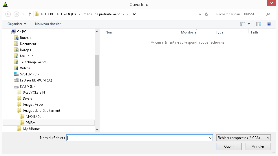 Lorsque je clique sur le bouton « Nom du fichier de reference d’offset » pour sélectionner les images la boîte de « Sélection des fichiers » s’ouvre. Dans le champ « Nom du fichier », « Fichiers compressés (*.cpa) » est placé par défaut alors que j’ai sélectionné « Fichiers de type FITS » par défaut dans le menu « Option des fichiers FITS/CPA et APN ».