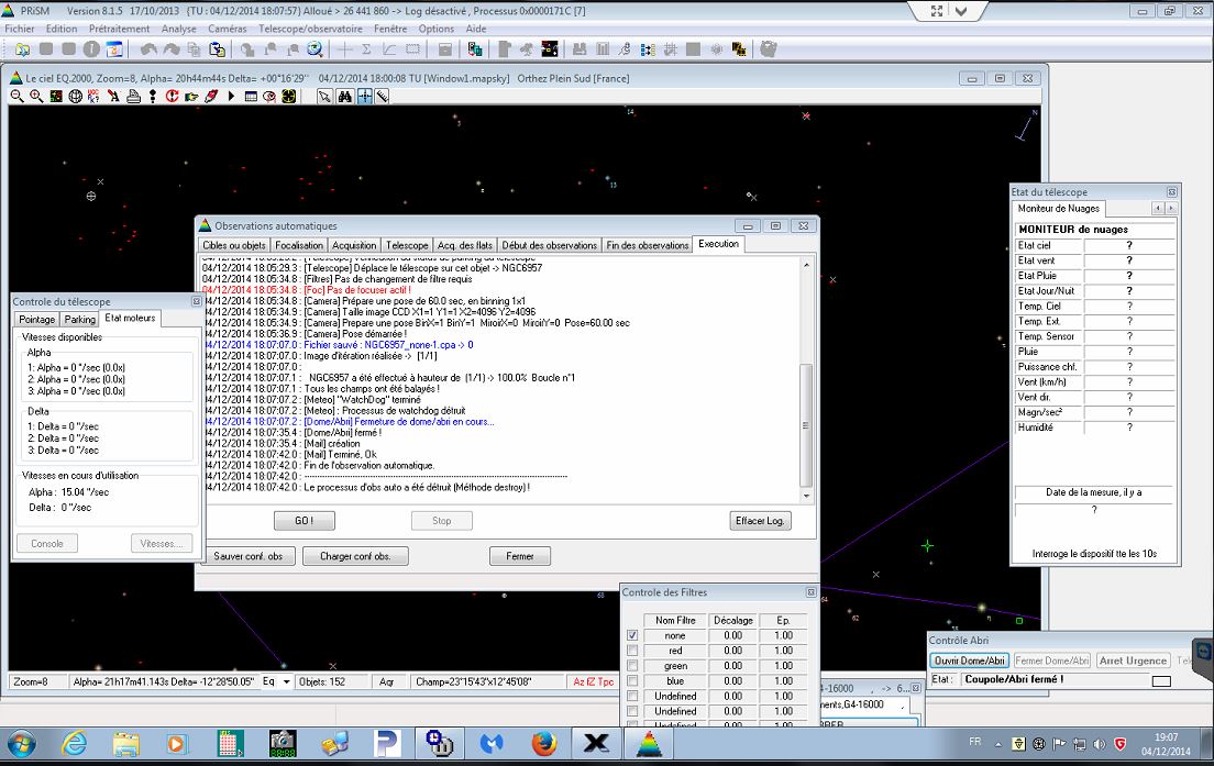 Le temps est en ce moment très couvert; j'ai malgré tout voulu tester l'observation automatique; comme le temps est couvert, la monture parque puis Prism se déconnecte en peu de secondes ("Prism ne répond pas..."), ainsi que TheSky. Je peux reconnecter facilement TheSky qui est resté ouvert mais pas Prism qui a dû se fermer (et qu'il faut alors rouvrir).