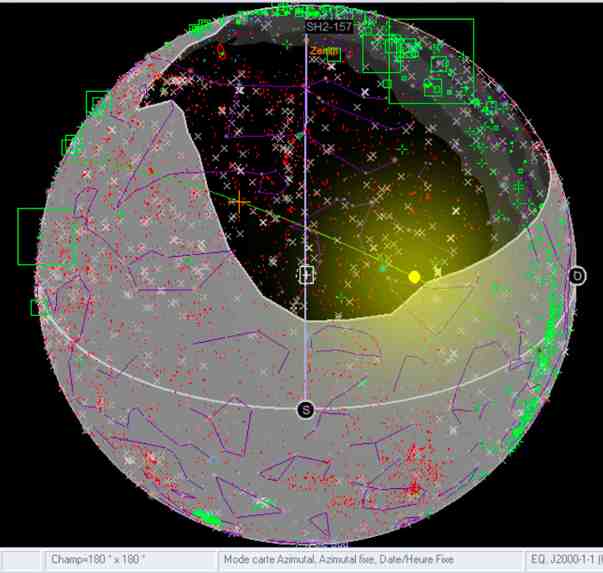 Les limites de visibilité du ciel apparaissent très bien sur la carte. Cependant, la zone du ciel dégagée est en noir uniquement vers le sud et non pour les autres points cardinaux où tout est gris au zoomx1 (images ci-dessous) En outre, si je grossis une zone du ciel grise bien qu'observable, elle devient noire à partir, ceci est valable du zoomx8 pour toutes les directions. Que faire? Réglages? Je n'ai pas trouvé. Bug?
