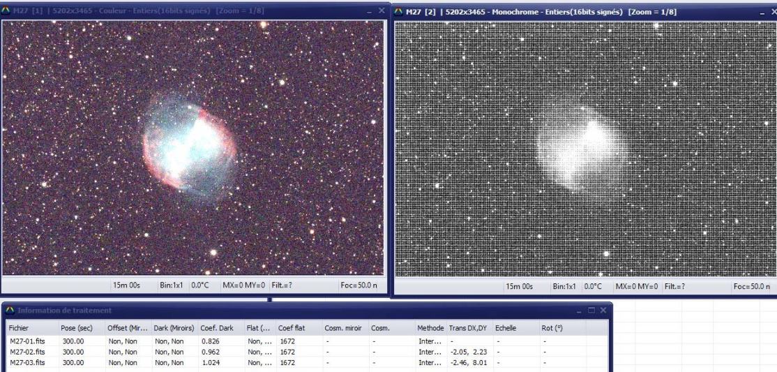 Deuxième question: Pourquoi il faut Activer la debayerisation? Sachant que les images sont prise avec un appareil défiltré? Il y a qqch qui m'échappe sur ce coup là ? J'ai réalisé 2 traitements (avec 3 photos) une avec la debayerisation activé et l'autre sans, on voit très bien la différence... Je me demandais aussi pourquoi je n'ai pas de rapport de l'échelle des images?