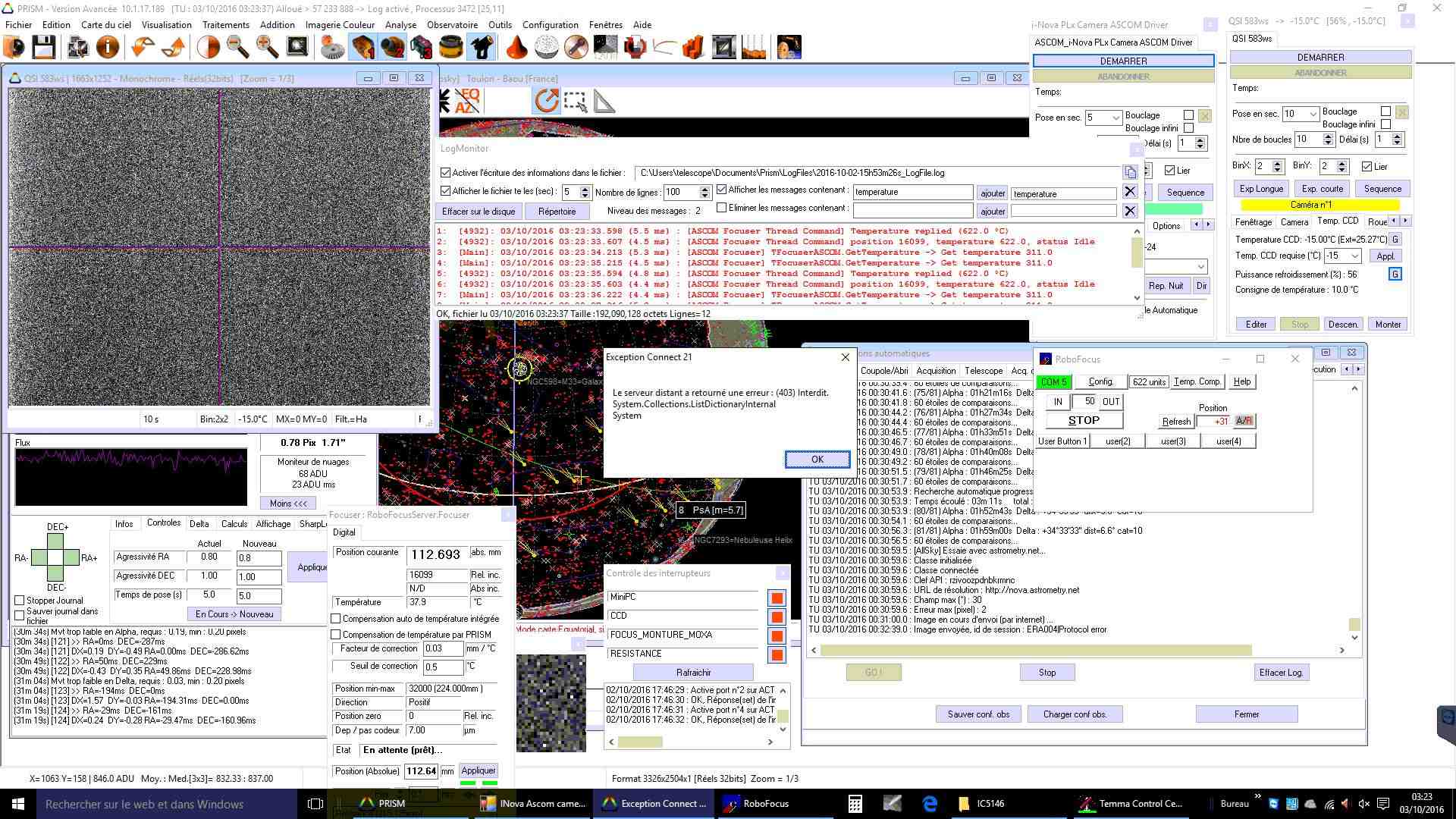 Sur la fenêtre d'observation automatique on peut voir que PRISM est resté bloqué de 0h32 à 3h23 au moment ou je l'ai débloqué manuellement. Le tube a continué à poursuivre l'objet visé (M33) jusqu'à cogner dans la monture (et oui, il n'y a pas de sécurité sur la TAKAHASHI EM200).