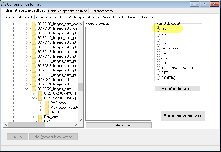 Je souhaiterais convertir des fichiers au format *.fits malheureusement la boîte de dialogue ci-dessous positionnée sur le filtre *.fits n'affiche pas les fichiers :