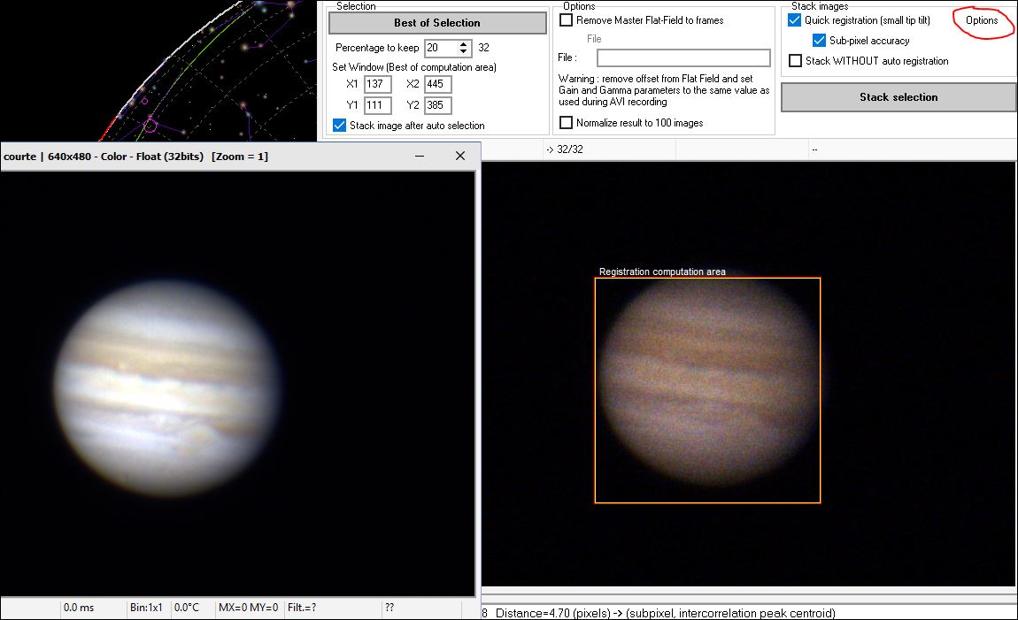 Après avoir visionné le tuto de Cyril sur le traitement des films AVI des images planétaires, je me suis essayé avec un vidéo AVI de Jupiter que m'a transmis un ami. Ce vidéo AVI a été pris avec une caméra ZWO 120mm avec roue a filtre avec un C11. Lorsque j'essais la fonction TRAITEMENT DE FILMS AVI dans Prism 10 version pro, le film se charge et lorsque j'applique la fonction BEST OFF, je remarque que le logiciel sélectionne premièrement une image sur deux et lorsqu'il sort l'image additionné, il n'y a rien. J'ai revu à plusieurs reprises le tuto vidéo et essayé plusieurs sélections autour de la planète et rien n'y fait. Le vidéo originale est en 24 bits AVI sans compression. Prism 10 le lit très bien.