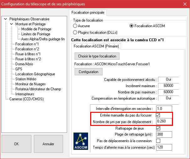 Je suis alors obligé de cocher à nouveau la case "Entrée manuelle du pas focuser" et de rentrer la valeur 0.26 dans "Nombre de µm par pas de déplacement :".