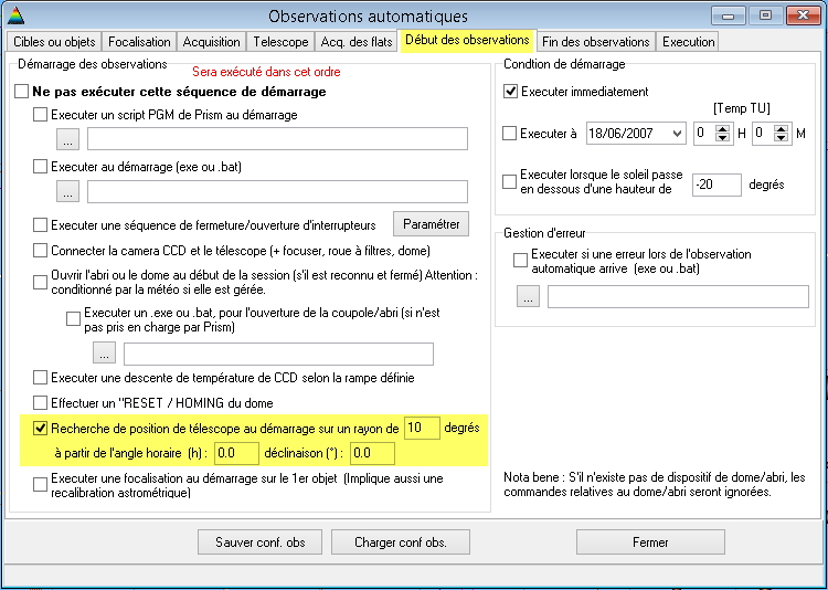 Observations automatiques, onglet début des observations, recherche de la position du télescope, version 8.1.5