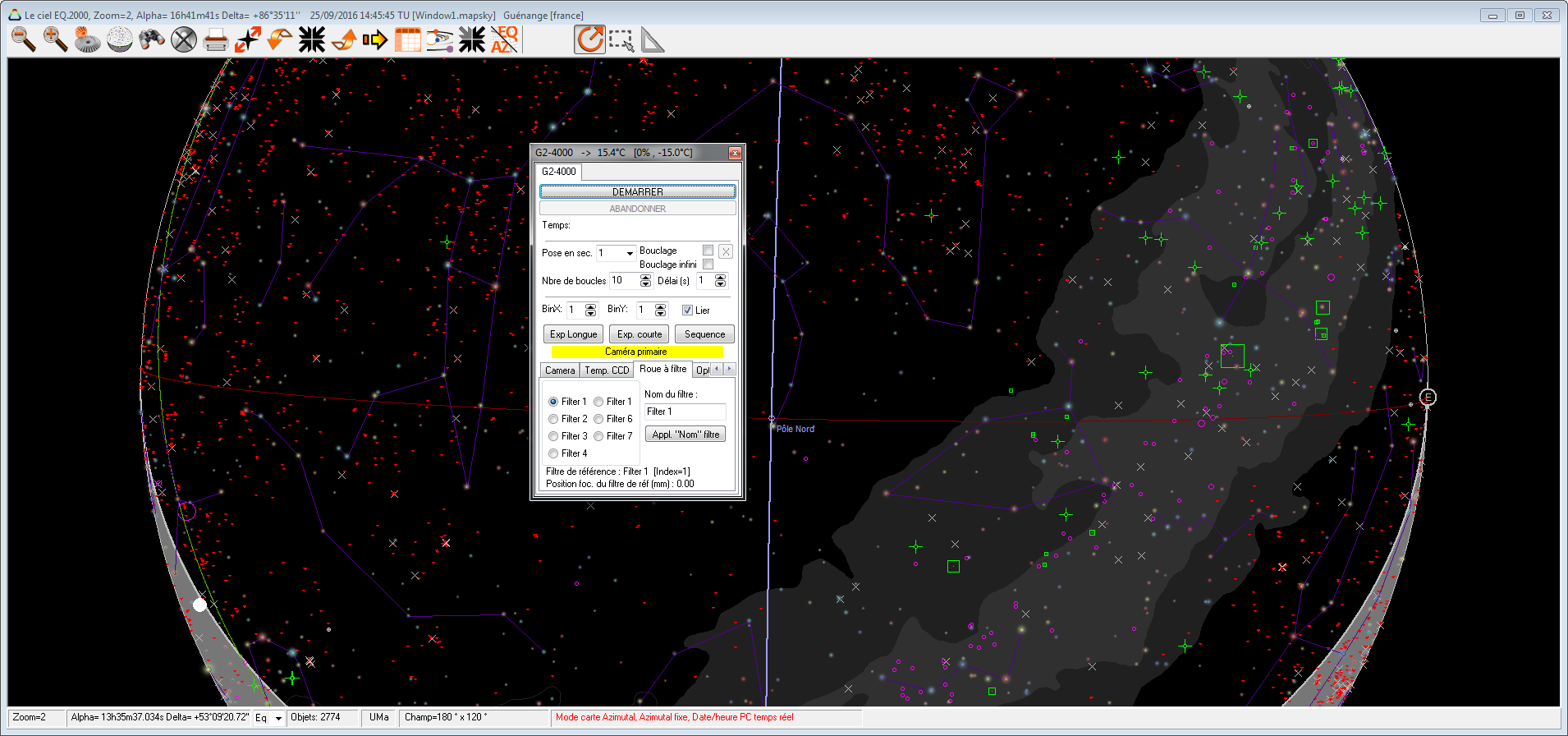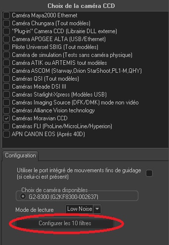 Bonjour,toujours les mêmes Pb de roue a filtre avec la roue a filtres ext de la Moravian G2,elles est aussi pas reconnue dans le menu "Observatoire/contrôle de la roue a filtre dans Prism 10,avant sur Prism 9,je n'avait pas ce Pb, je n'avait pas besoins de passer dans le menu indépendant tourelle de filtre de le menu "observatoire/contrôle de la roue a filtre n°1.Pour l'instant j'ai juste la caméras qui fonctionne sans la roue a filtre, j'ai mie les pilotes a jour.