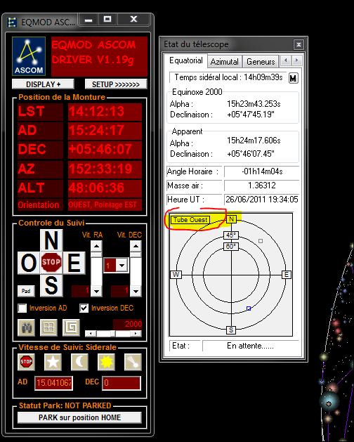 Le problème reste le même, quand le tube est à l'ouest, lors du pointage du télescope la coupole ne se positionne pas en face. En fait sa position serait bonne si le tube avait été à l'est. Après le pointage si je clique sur Aligner au télescope, la coupole vient au bon endroit. De même si l'on attend un peu, la fonction "suivi coupole" remet la coupole en face.