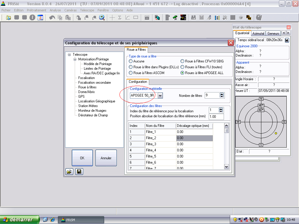 Peux tu me faire des copies d'ecran des successions de tes actions ?[Roue à filtres APOGEE] : Initialisation