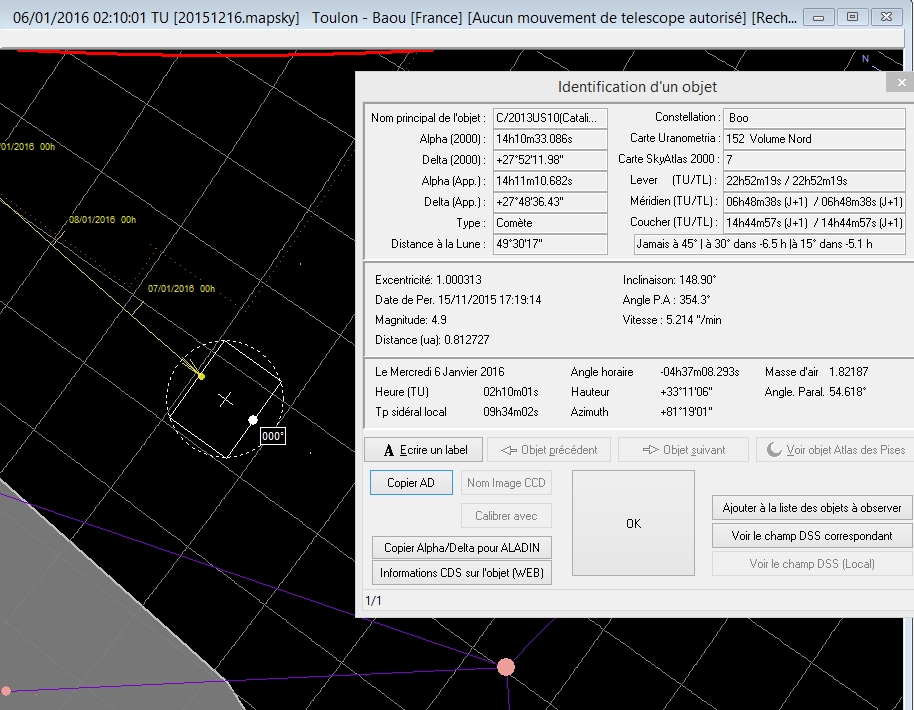 A l’aide de la carte du ciel il faut repérer le moment (réglage de la date et de l’heure) ou la comète se dégage de l’horizon local. J’utilise la fonction «ANIMATION » de la carte du ciel. Dans l’exemple ci-dessous j’obtiens l’heure d’observation : 2h10 TU. J’utilise ensuite la fonction « IDENTIFICATION D’UN OBJET » pour obtenir les coordonnées AD et DE de la comète.
