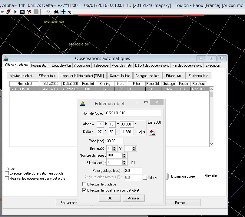 Ensuite je les copie dans l’éditeur de l’OBSERVATION AUTOMATIQUE pour programmer les acquisitions et les déclencher à l’heure obtenue plus haut. L’inconvénient du module OBSERVATION AUTOMATIQUE est que les coordonnées de l’objet imagé sont figées.