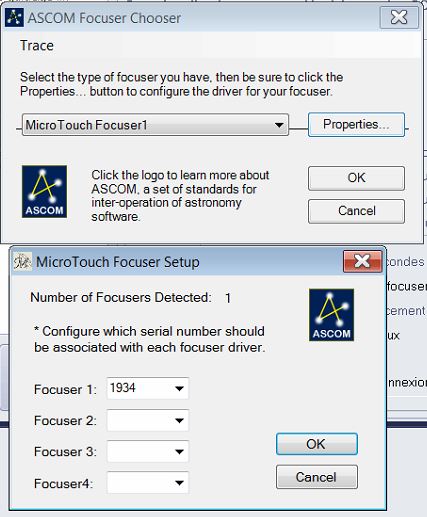 Je vais dans configuration matériel/focalisation, je choisis MicroTouch Focuser 1 (driver ASCOM charger préalablement). Enusite je vais dans Proprieties et la il me demande de choisir le serial number associé a chaque focuser (dans mon cas 1 seul et c'est 1934 seul choix possible)