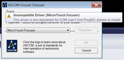 Il y a bien qqn qui utilise un autofocuser MicroTouch avec ASCOM et PRISM? J'utilise la plateform 6.2 de ASCOM ca peut être du a cela ?