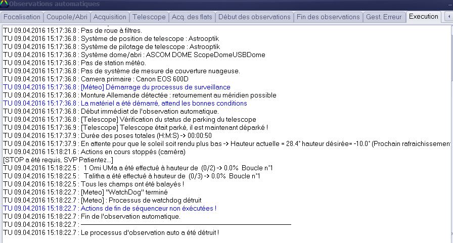 J'ai envi de te répondre le maximum que je puisse surtout le fonctionnement du télescope et du dome. La nuit passée, j'ai effectué des tests et je voulais voir pour qu'en cas d'erreur le telescope retourne au park et la coupole se ferme. En stoppant la séquence automatique, le télescope est aller au park, mais la coupole, elle, n'est pas aller à sa position de fermeture (107° dans mon cas mais s'en est approchée quand même). D'après se qui est écrit dans l'onglet gestion des erreurs, si l'on interrompt l'observation auto, ni les actions de fin ni la gestion des erreurs ne seront effectuées. Hors le télescope lui est aller au park et la coupole s'est déplacée pour essayer de se fermer mais n'a pas réussi. Outre le fait que en cas d’arrêt de la procédure le système ne devrait pas bouger (c'est ce que je comprend en fait