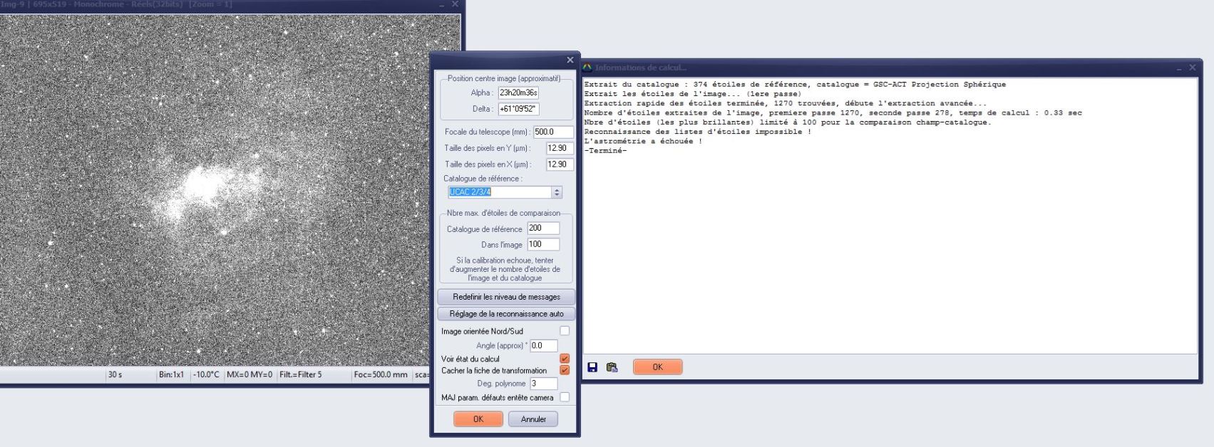 2) Ensuite j'ai essayer en utilisant le catalogue UCAC 2/3/4 (préalablement installé) et la BINGO sa fonctionne. (Photo Astrométrie 1 et 2 pour illustrer mes propos)