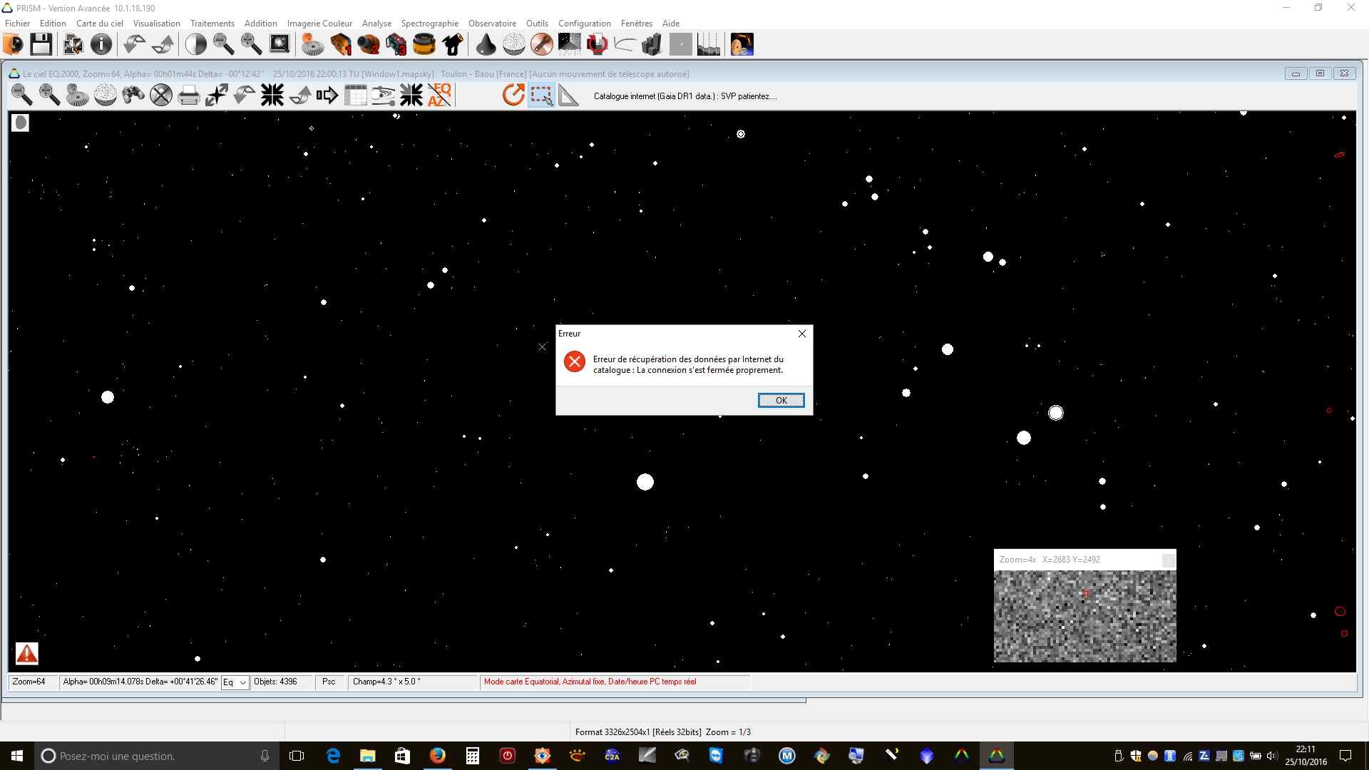 Dans la version PRISM 10.1.18.190 du 21/10/2016 je rencontre des difficultés pour afficher les étoiles du catalogue GAIA (idem pour l'astrométrie). Il semble que le paramétrage de la connexion vers le site internet VizieR soit défectueuse. L'erreur affichée est : "Erreur de récupération des données par Internet du catalogue. La connexion s'est fermée proprement"