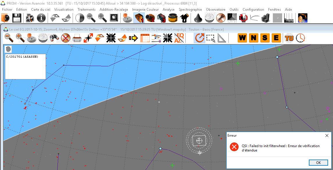 Je viens d’installer la version PRISM 10.3.35 et dès le démarrage il s’affiche une boîte de dialogue indiquant : « QSI : Failed to init filterwheel : Erreur de vérification d’étendue ».