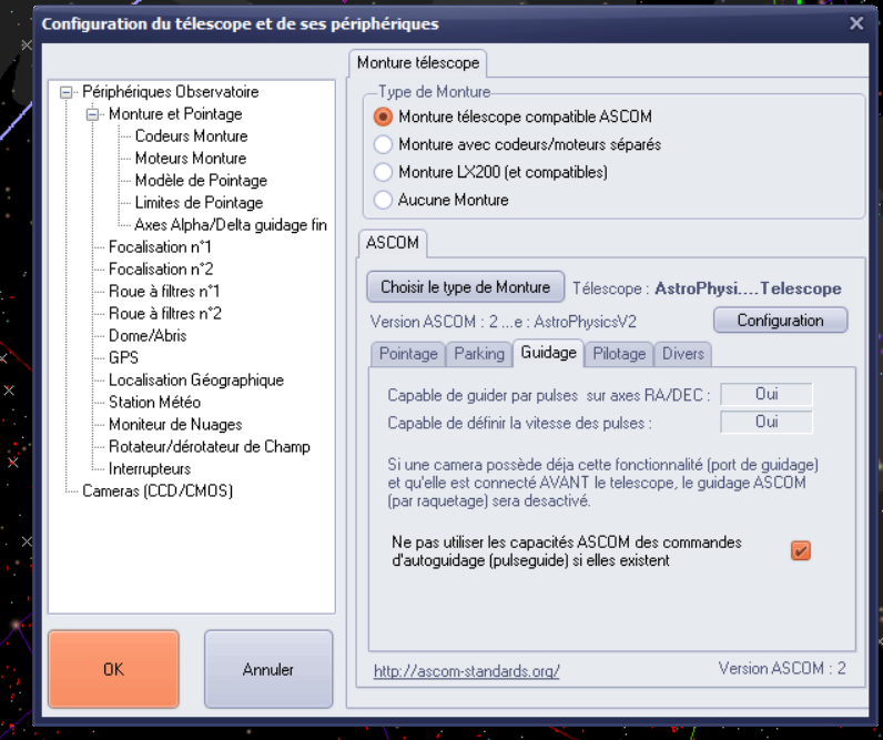 J'ai déclaré en configuration de la monture dans l'onglet guidage ""NE PAS UTILISER LES CAPACITES ASCOM DES COMMANDES D'AUTOGUIDAGE (PULSEGUIDE) SI ELLES EXISTENT (donc j'ai bien coché la case)
