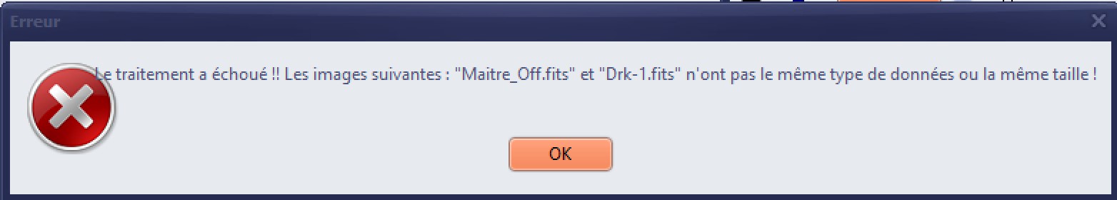 Bonjour, la fonction de pre-traitement de mes images n'aboutie pas car mes Flats et Offsets ont, pour une raison que j'ignore, une géométrie différente (4944x3284) de celles de mes Darks et images (3284x4944).