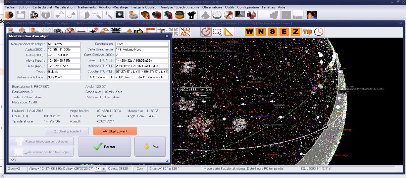 je vous joint la position dans PRISM de NGC 4565 à l'heure de la fin de la dernière image en B (voir attaché), et la position de l'objet BSC6212, direction EST , a 59 degré de hauteur (voir attaché)