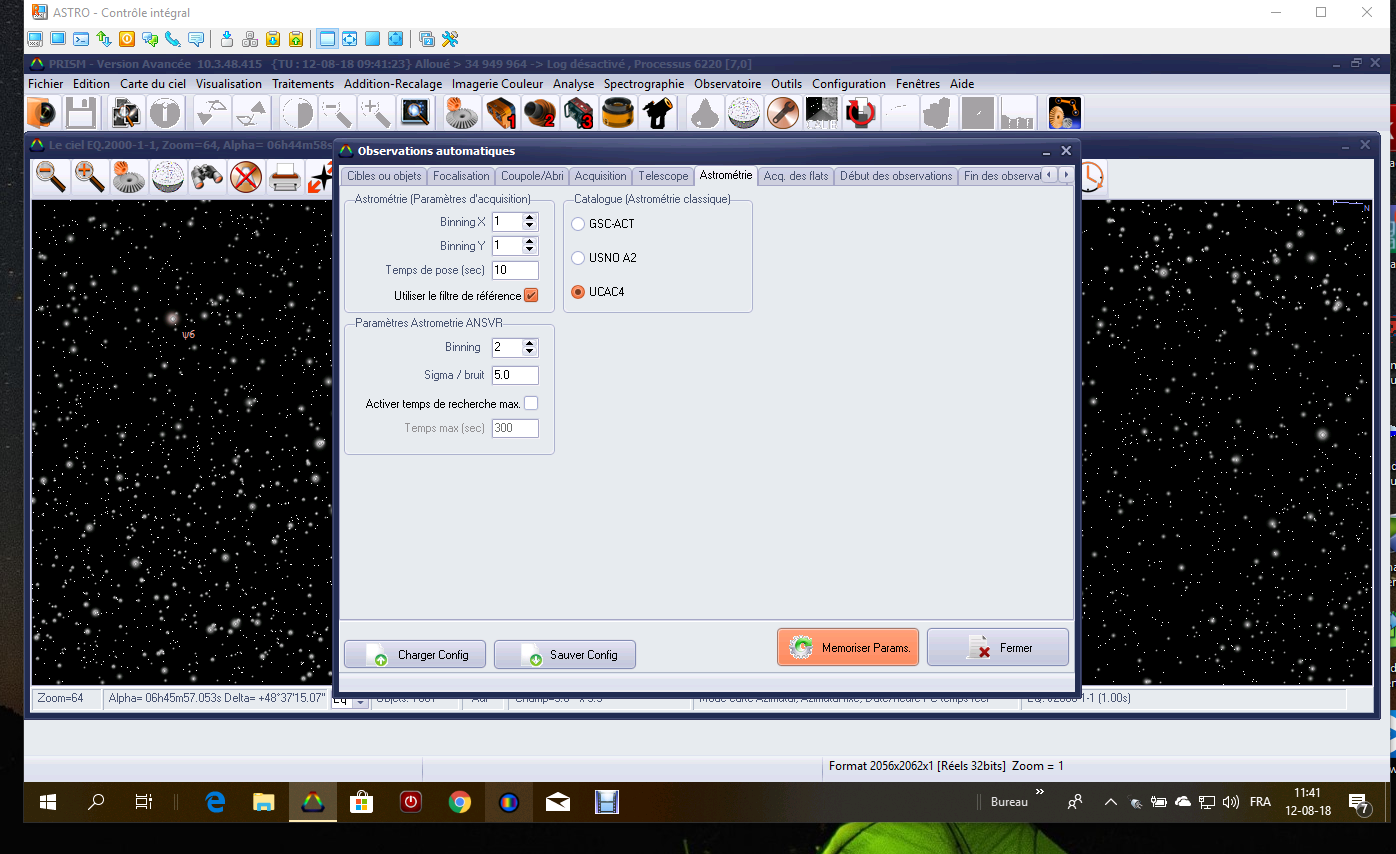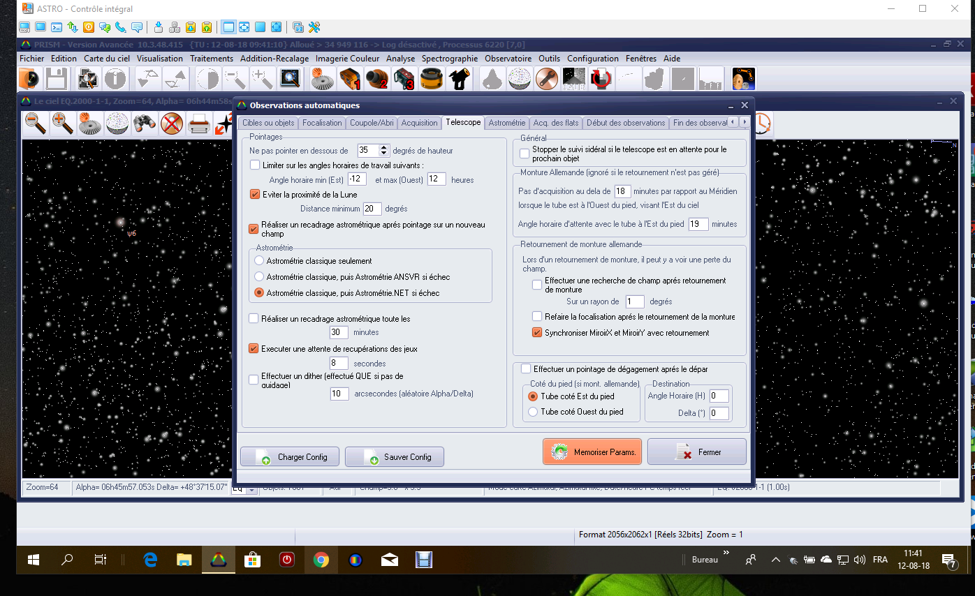 J'utilise le Pc de mon bureau pour les simulation, avec PRISM ou avec un autre logiciel (carte du ciel) pour le positionner à l'EST et voir quelle serait la position de l'étoile à la fin de l'objet principal. Je pense que vu que je n'ai pas de log , nous ne trouverons pas la cause...mais je vais refléchir à mettre une "butée" qui cloture et passe à la fin des observations, parking et exécution des scripts de fin. a tester.