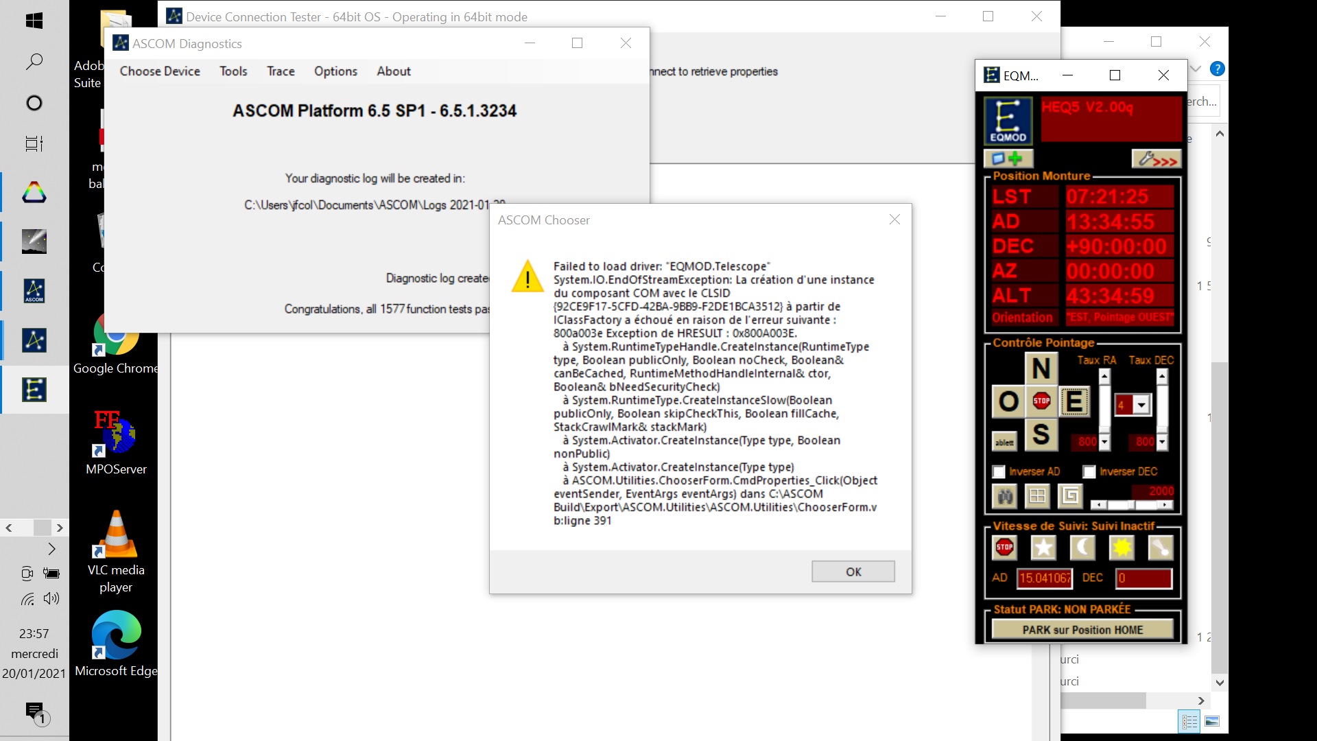 Desinstaller la plateforme ascom, les drivers ascom et faire un ccleaner a la fin sur la base de registre et reinstaller la platerforme, pluis les drivers.